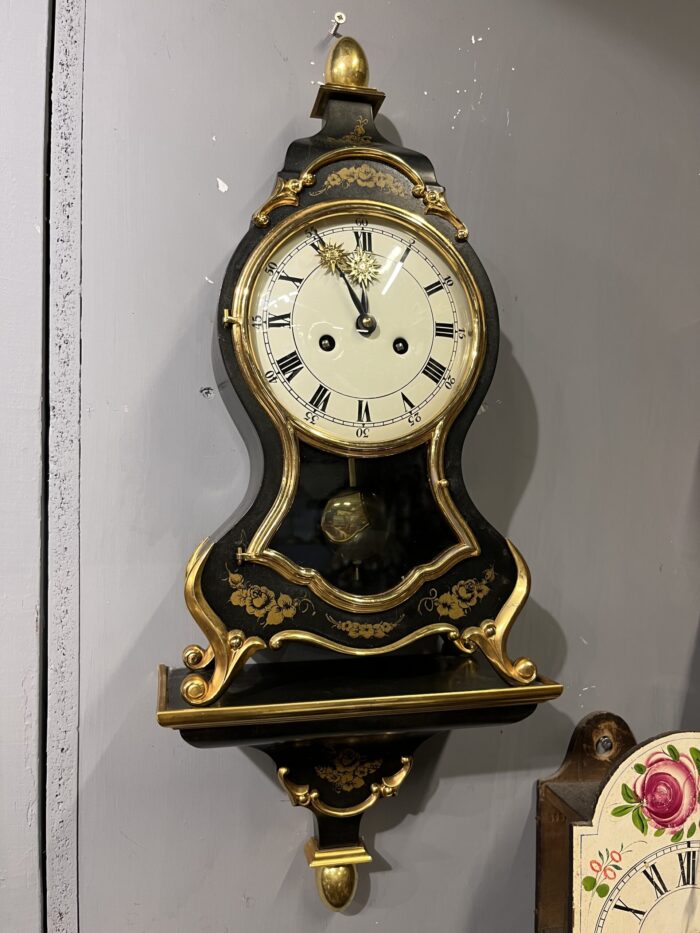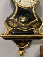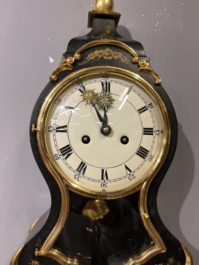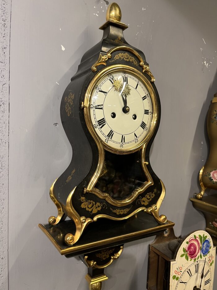 Klasik Fransız tarzını yansıtan bu şık duvar saati, zarif formu ve altın tonlu detaylarıyla dikkat çeken dekoratif bir parçadır. Siyah zemin üzerine işlenmiş altın floral motifler ve kıvrımlı hatlara sahip kasası, ürüne oldukça estetik ve asil bir görünüm kazandırır. Roma rakamlı kadranı ve camlı ön yüzeyiyle geleneksel saat tasarımını başarıyla yansıtır. Alt bölümde yer alan sarkaç mekanizması, saate hem hareket hem de nostaljik bir hava katar. Kurmalı mekanizmaya sahip olup klasik saat severler için ideal bir modeldir. Duvar dekorasyonu için güçlü bir tamamlayıcı olmasının yanı sıra koleksiyonluk değeri de bulunmaktadır. Salon, ofis veya klasik dekorasyona sahip alanlarda dikkat çekici bir parça olarak kullanılabilir. Yaklaşık 55 cm x 22 cm ölçülerindedir. Genel kondisyonu görsellerde görüldüğü gibidir.