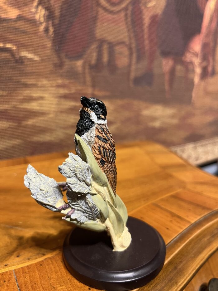 Vogelwelt Collection serisine ait bu zarif kuş figürlü biblo, detaylı işçiligi ve doğal renk tonları ile dikkat çeken koleksiyonluk bir parçadır. Üzerindeki kuş figürü (Rohrammer – saz kamışı kuşu), gerçekçi tüy dokusu ve doğal duruşuyla oldukça estetik bir görünüm sunar. El boyaması olması sayesinde her ürün kendine özgü karakter taşır ve bu da ürüne koleksiyon değeri kazandırır. Alt kısmında yer alan orijinal etikete göre tasarım Andy Pearce tarafından hazırlanmış olup Eaglemoss üretimidir ve 2004 yılına aittir. Bitki ve dal detayları ile zenginleştirilmiş kompozisyonu sayesinde dekoratif olarak oldukça şık durur. Vitrin, masa ve raf dekorasyonlarında rahatlıkla kullanılabilir. Vintage koleksiyon ürünleri sevenler için dikkat çekici ve değerli bir parçadır. Ataantik05 mağazası için özenle seçilmiştir.