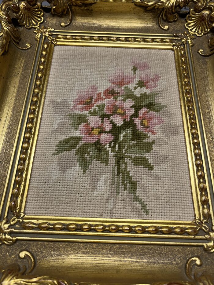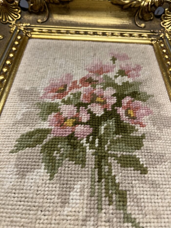 Ana Sayfa MOBİLYA ve TABLOLAR El İşçiliği Goblen Çiçek Tablosu – Altın Varak Klasik Çerçeve (38×32 cm)