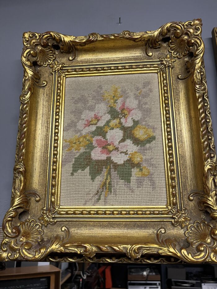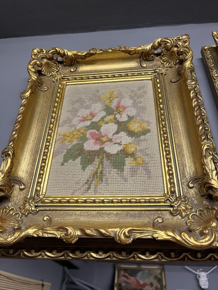 Ana Sayfa MOBİLYA ve TABLOLAR El İşçiliği Goblen Çiçek Tablosu – Altın Varak Oymalı Çerçeve (38×32 cm)