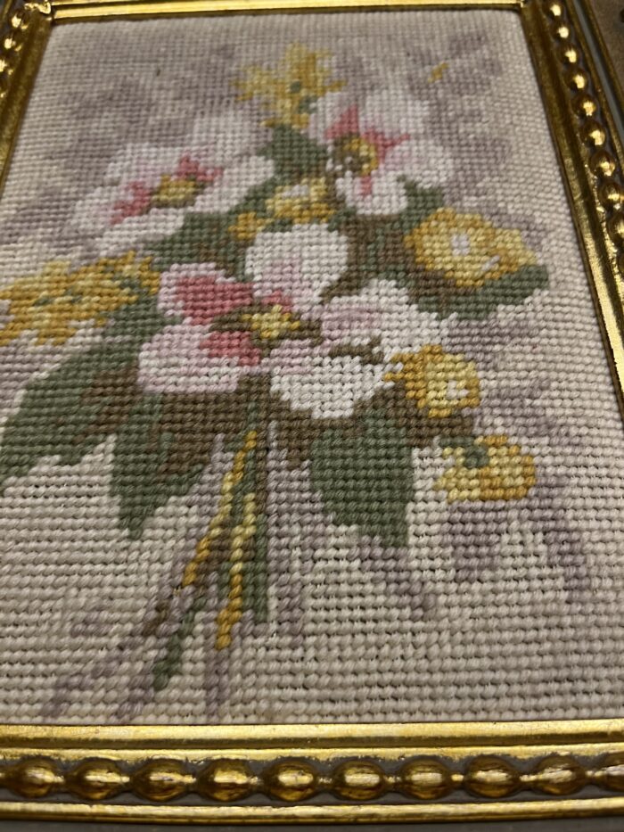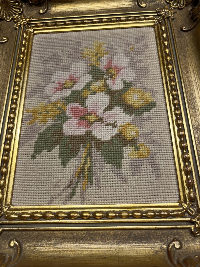 Zarif çiçek motifleriyle işlenmiş el yapımı goblen tablo.