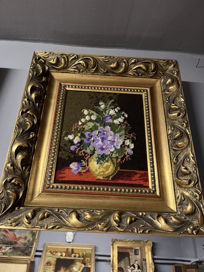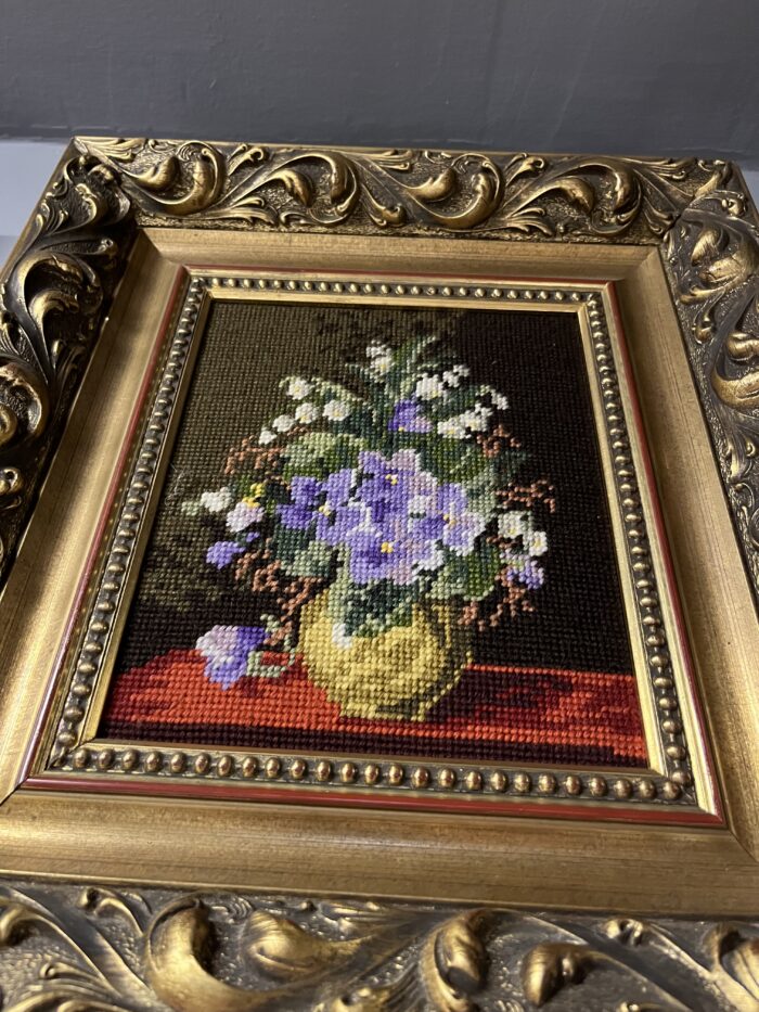 El İşçiliği Goblen Çiçek Tablosu – Altın Varak Oymalı Çerçeve (40×36 cm)