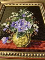 Zarif çiçek motifleriyle işlenmiş el yapımı goblen tablo.
