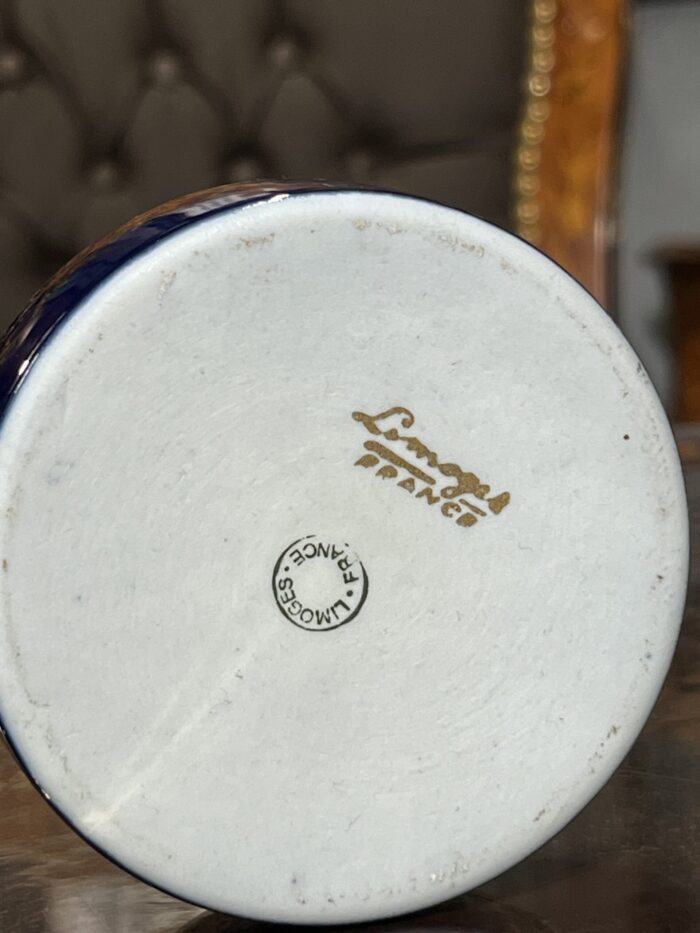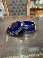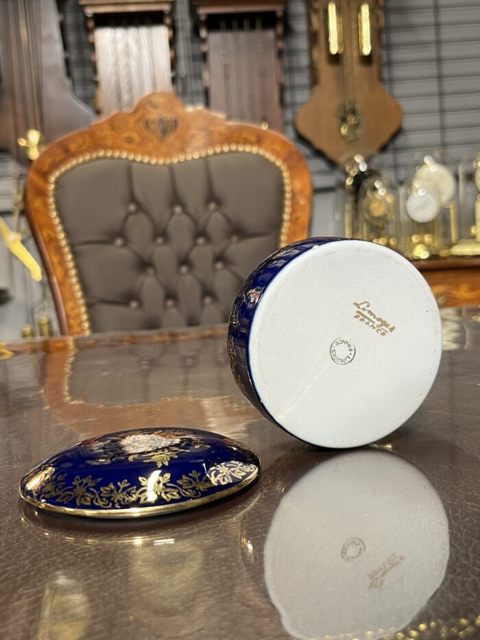 Kobalt mavi rengi ve altın dekorlarıyla öne çıkan zarif bir Limoges porselen kutudur.
