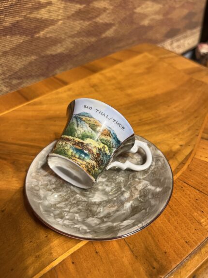 Almanya üretimi Bad Thal Thür temalı, mermer desenli özel tasarım antika porselen kahve fincanı ve tabağı. Koleksiyonluk ve dekoratif değeri yüksek nadir parça. Fincan altındaki damga ve “Bad Thal Thür” yazısı, ürünün Almanya Thüringen bölgesine ait olduğunu gösterir. Mermer efektli dış yüzey ve iç kısımdaki el işçiliği izleri, 20. yüzyıl ortası üretimlerine işaret eder. Hem koleksiyon hem dekor amaçlı değerlidir.
