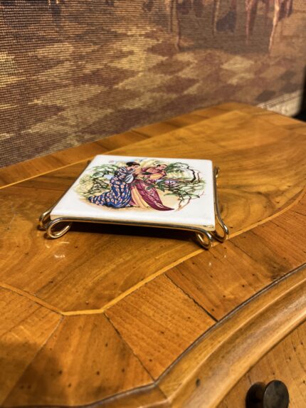 İtalyan üretim, Uzak Doğu desenli porselen fincan altlığı. Altın çerçeveli şık tasarımıyla hem dekoratif hem koleksiyonluk kullanım için idealdir. Ölçü: 12x12 cm.