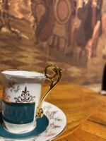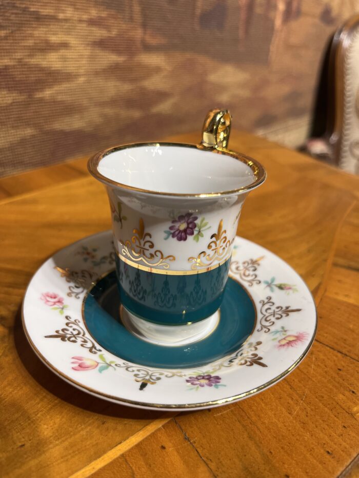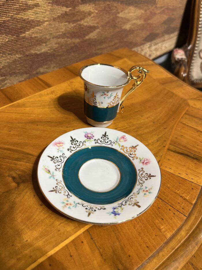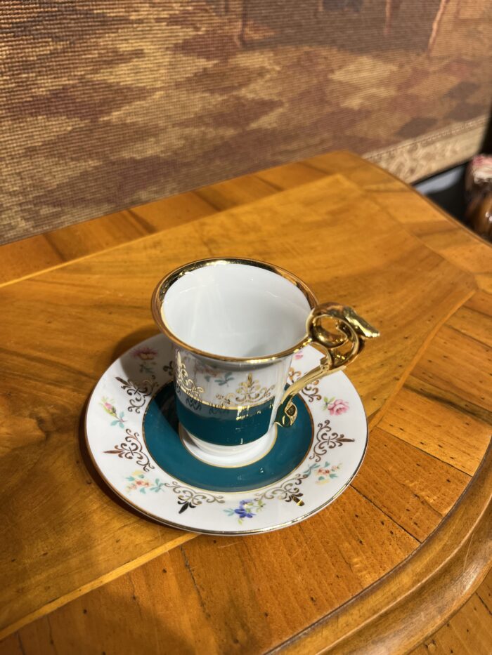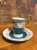 El işçiliği (handgefertigt) porselen kahve fincanı ve tabağı. Üzerinde klasik dönem kadın figürü, yeşil zemin üzerine altın yaldız detaylar ve üç ayaklı özel fincan formu bulunmaktadır. Koleksiyonluk ve dekoratif değeri yüksek nadir bir parçadır.