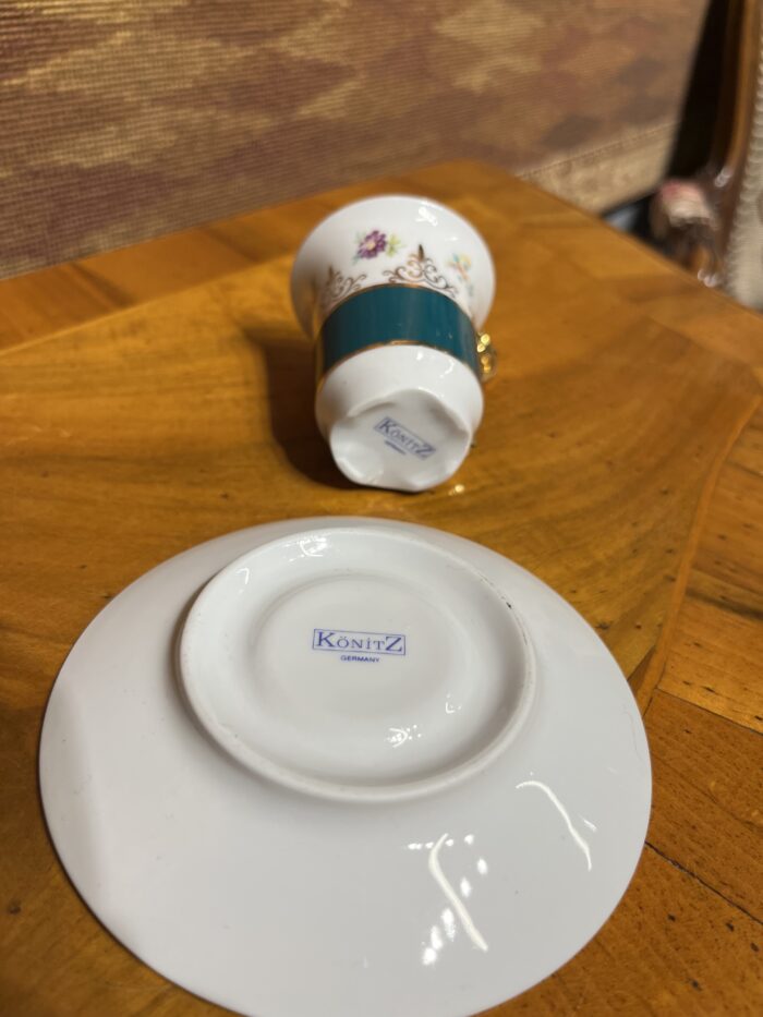 Alman üretimi Könitz Germany damgalı, zarif altın yaldızlı ve yeşil kuşak detaylı porselen kahve fincanı ve tabağı. İnce işçilikli kulp tasarımı ve floral motifleri ile koleksiyonluk ve dekoratif kullanım için ideal vintage bir settir. Könitz markası kaliteli Alman porselen üreticilerindendir. Bu tarz altın yaldızlı ve özel kulplu modeller piyasada orta-üst segment koleksiyon ürünü olarak değerlendirilir.