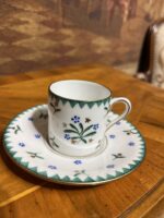 Set üzerinde yer alan yeşil geometrik bordür, altın yıldız süslemeleri ve mavi çiçek motifleri tamamen klasik Avrupa tarzını yansıtır. İnce porselen yapısı ve zarif kulp formu, hem koleksiyon hem de dekoratif kullanım için idealdir.