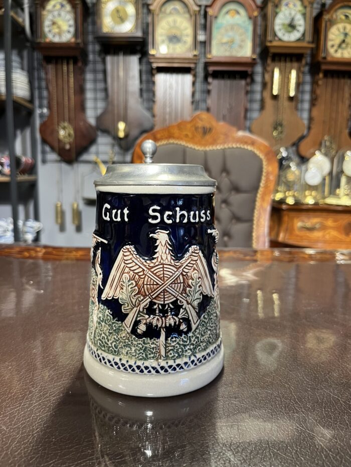 Vintage Gerz Kapaklı Seramik Kupa Bardak – “Gut Schuss” Avcı Temalı Alman Koleksiyonluk (16×10 cm)