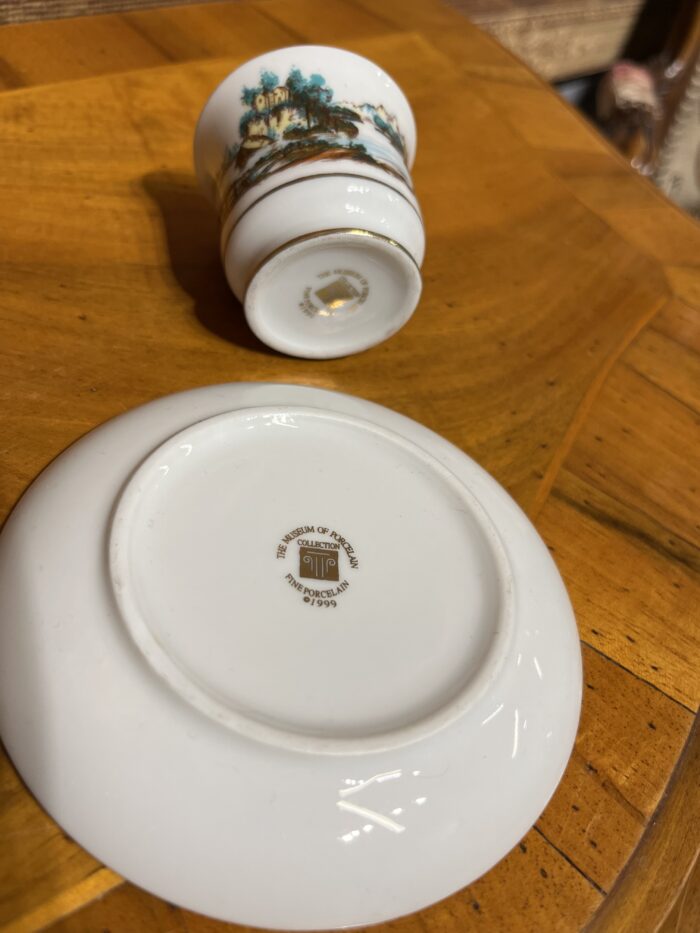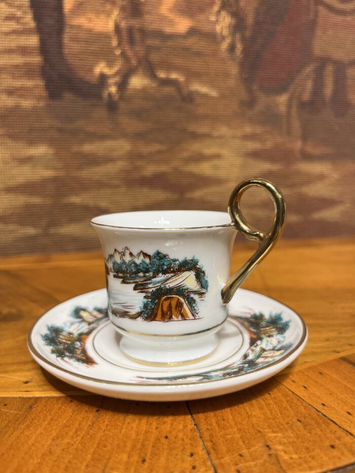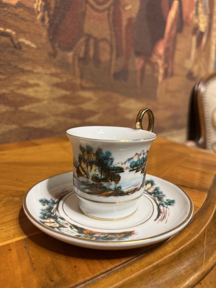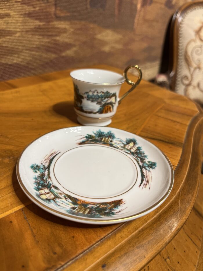 Şık peyzaj desenli, altın yaldız detaylı vintage porselen kahve fincanı ve tabağı. 1999 üretim “Museum of Porcelain Collection” serisine ait özel bir parçadır.