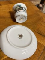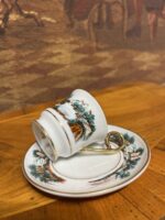 Bu tarz 3 ayaklı (tripod) fincanlar genellikle Avrupa üretimi olup, 1960–1980 arası vintage dönemine aittir. Altın varak bordür ve desen yapısı, orta segment kaliteli porselen grubuna girer. Dekoratif değeri yüksek, koleksiyon ve hediye amaçlı tercih edilir.