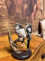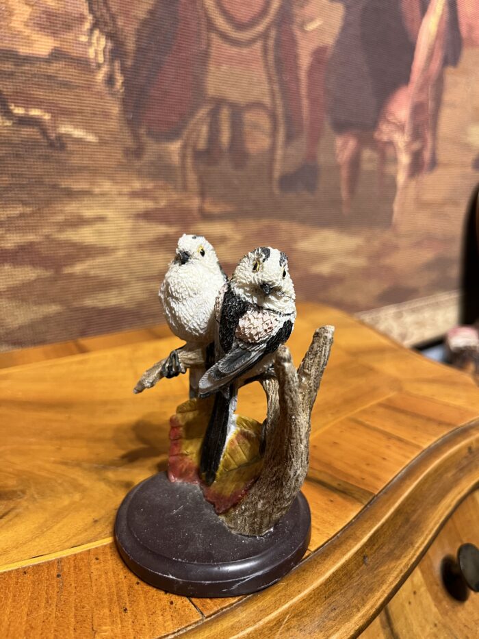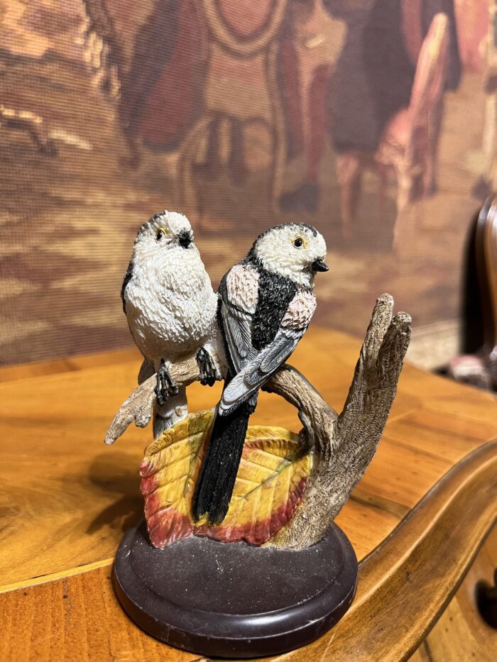 Vintage Schwanzmeise kuş çifti figürü, dal ve yaprak detaylarıyla tasarlanmış estetik ve dekoratif bir parçadır.